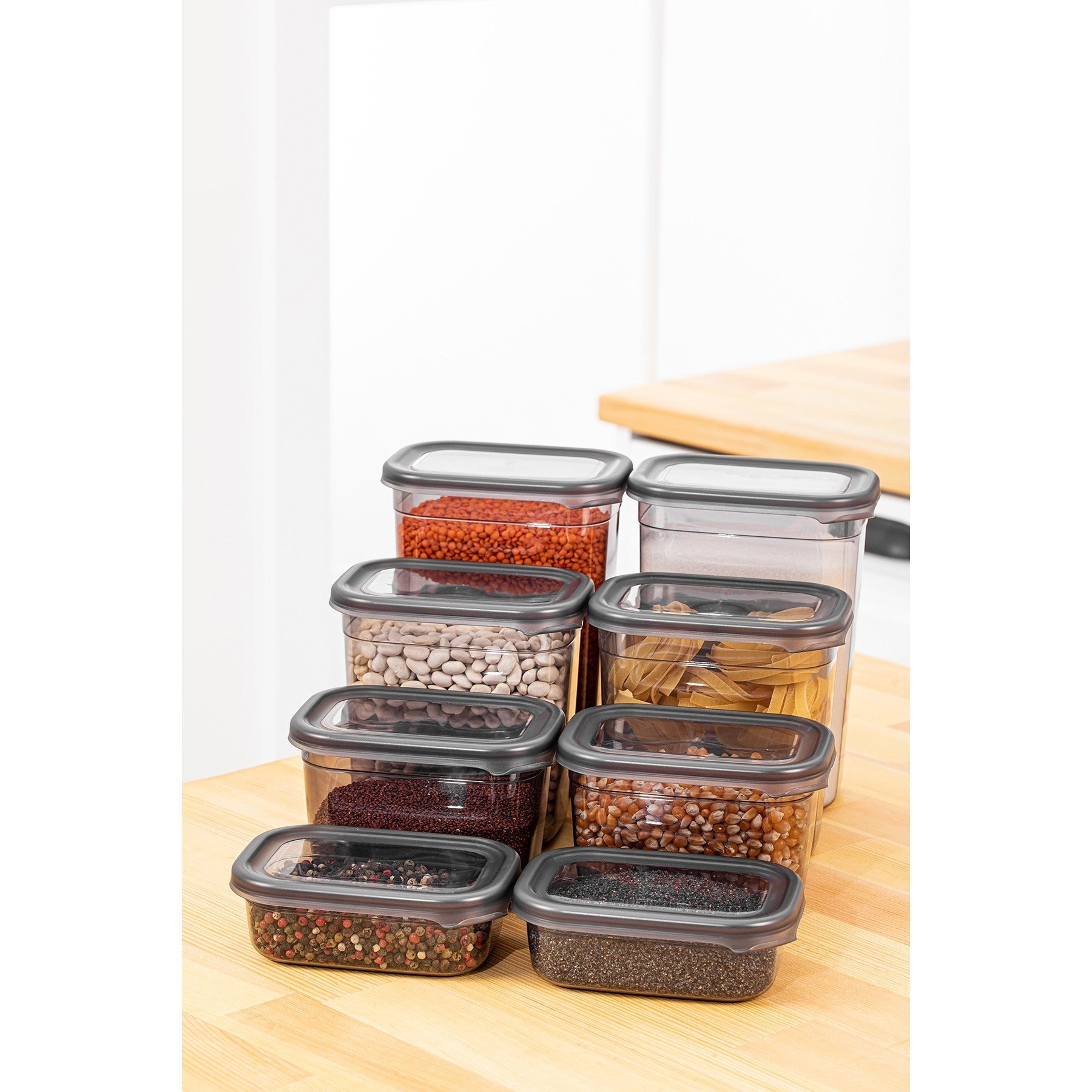 Ez a készlet négy különböző méretet tartalmaz, így biztosítva, hogy minden tárolási igényéhez a tökéletes tárolóedényt megtalálja. A kis csecsebecséktől a nagyobb tárgyakig ezek a dobozok mindent lefednek. A 400 ml-es, 800 ml-es, 1150 ml-es és 1500 ml-es méretekből egyenként két darabot tartalmaz, így soha nem fog kifogyni a helyből.