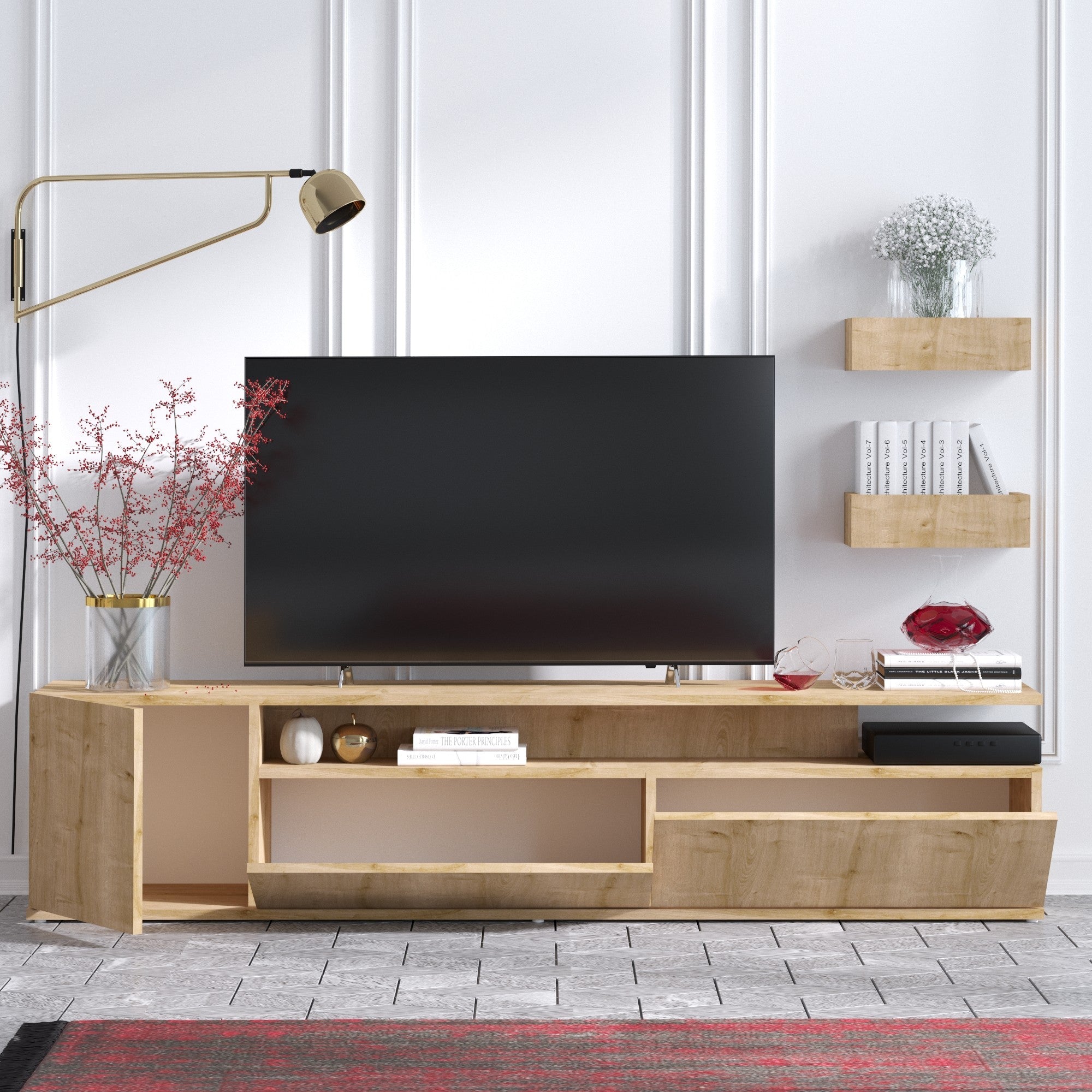 A tv egységhez két fali polc tartozik, amelyek 35 cm szélesek, 10 cm magasak és 15 cm mélyek. Ezek a polcok könnyen a falra rögzíthetők, így kedvenc könyveidet, fotóidat vagy gyűjteményes tárgyaidat is bemutathatod. Stílusosabbá és funkcionálisabbá teszik lakótérét.