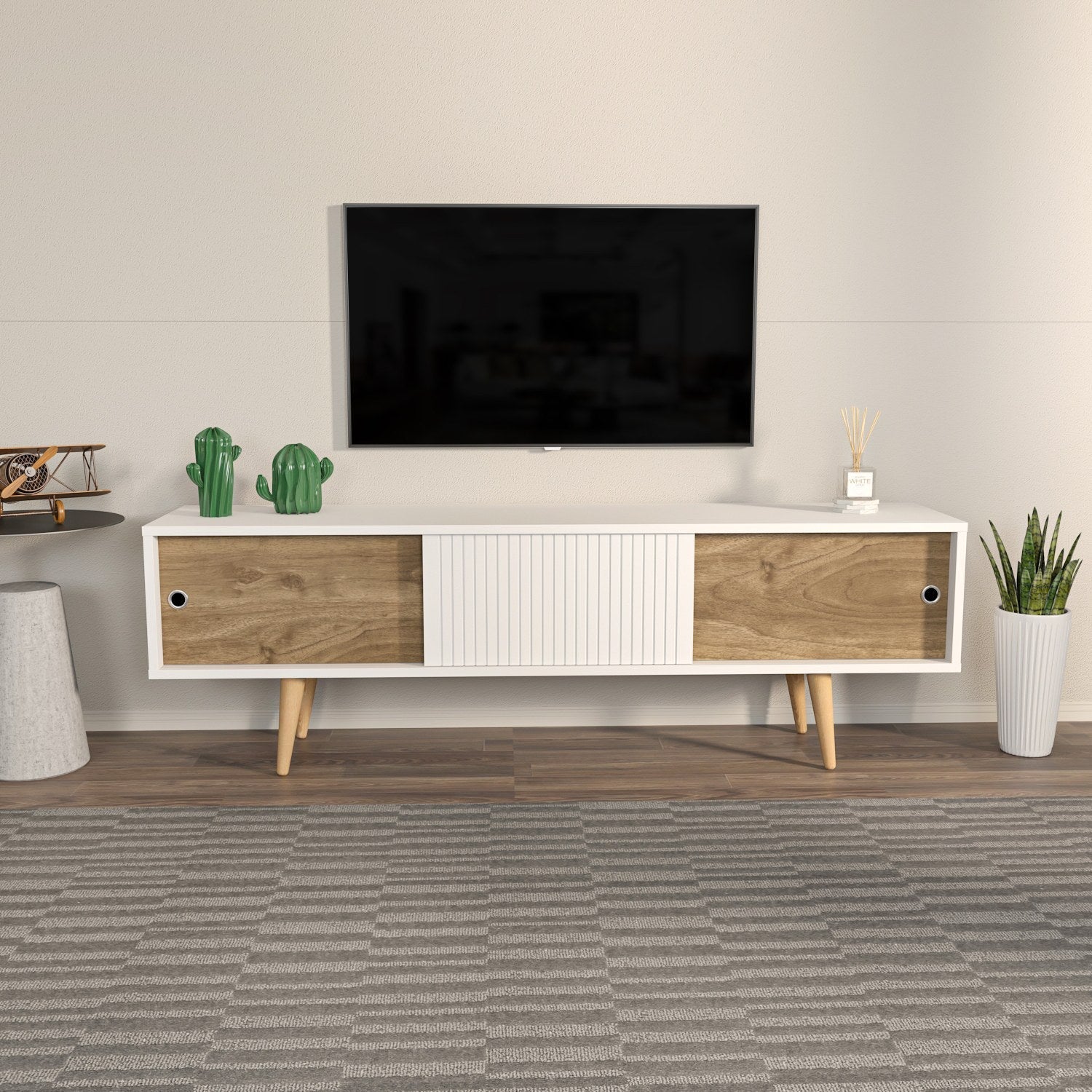 Elegáns kialakításával és modern vonzerejével tv-állványunk könnyedén kiegészít bármilyen dekorációt. A fehér és a diófa szín kombinációja kifinomultságot kölcsönöz, így a nappali középpontjává válik. Tágas méreteinek köszönhetoen 160 cm széles, 45 cm magas és 34. 5 cm-es mélysége boséges tárolóhelyet biztosít a médiaeszközök, dvd-k és egyéb alapveto dolgok számára.
