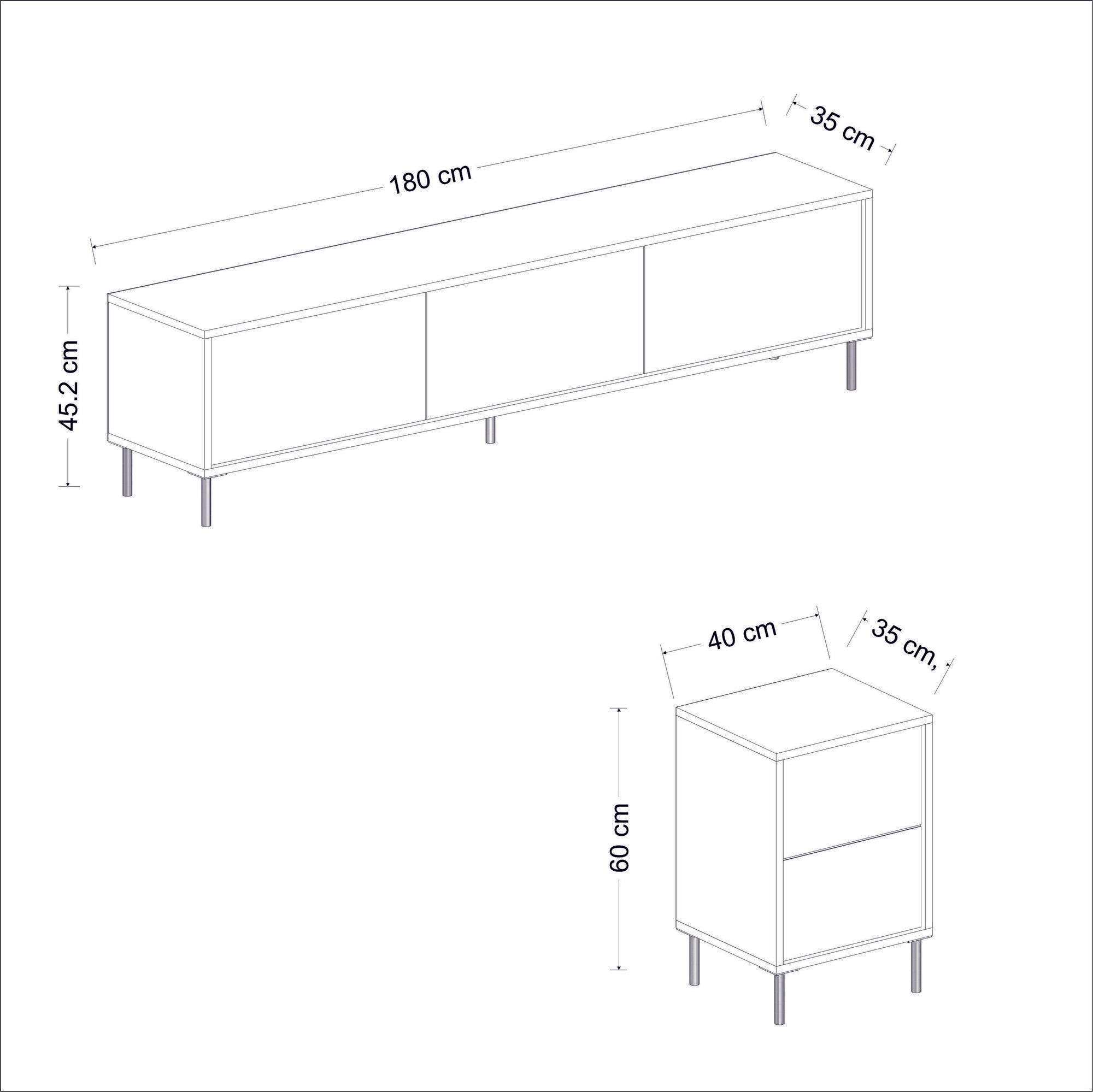 A tágas, 180 cm széles, 45. 2 cm magas és 35 cm mély tv-állványban könnyedén elfér a televízió és más médiaeszközök. A két, egyenként 40 cm széles, 60 cm magas és 35 cm mély szekrény boséges tárolóhelyet biztosít a dvd-k, játékkonzolok és egyebek számára. A számos polc lehetové teszi, hogy rendezetten rendszerezze holmijait, így lakótérét rendetlenségtol mentesen tarthatja.