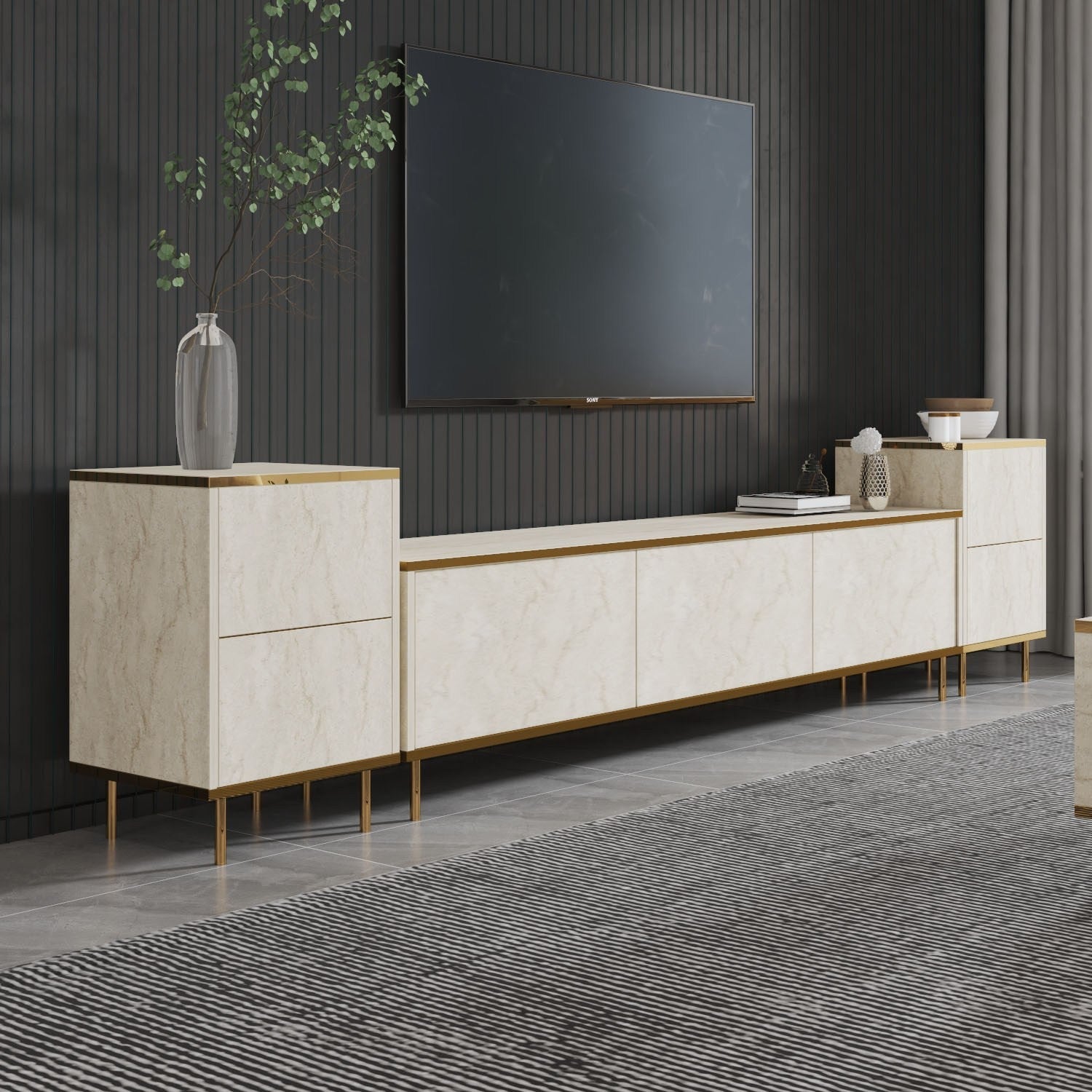 A travertin és az arany színek kombinációja olyan márvány ihlette megjelenést kölcsönöz ennek a tv egységnek, amely bőséget és előkelőséget sugároz. Az elegáns és modern kialakítás azonnal feldobja a nappali esztétikáját.