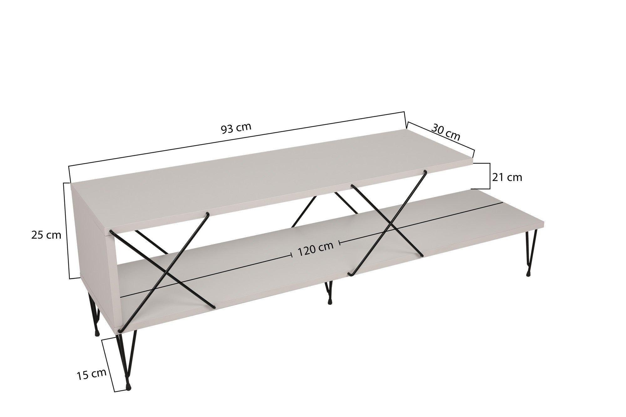 A számos polccal ellátott tv-állványunk bőséges tárolóhelyet biztosít minden szórakoztatóipari kelléknek. A játékkonzoloktól a dvd-lejátszókig mindent rendszerezve és elérhető közelségben tarthat. A 120 cm hosszú alsó polc bőséges helyet kínál a nagyobb tárgyak számára, míg a 93 cm-es felső polc tökéletes a dekorációs tárgyak elhelyezésére.