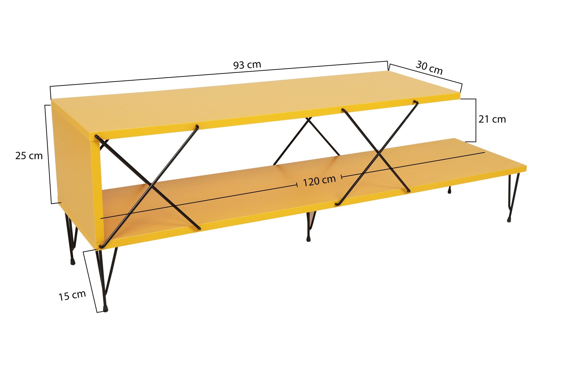 A számos polcnak köszönhetően ez a tv-állvány rengeteg helyet kínál a médiaeszközök, játékkonzolok, dvd-k és egyéb eszközök tárolására. Az alsó polc, amely a teljes hosszában 120 cm-es, bőséges helyet biztosít a nagyobb tárgyak számára, míg a 93 cm-es felső polc tökéletes a dekorációs darabok vagy kisebb elektronikai eszközök bemutatására.