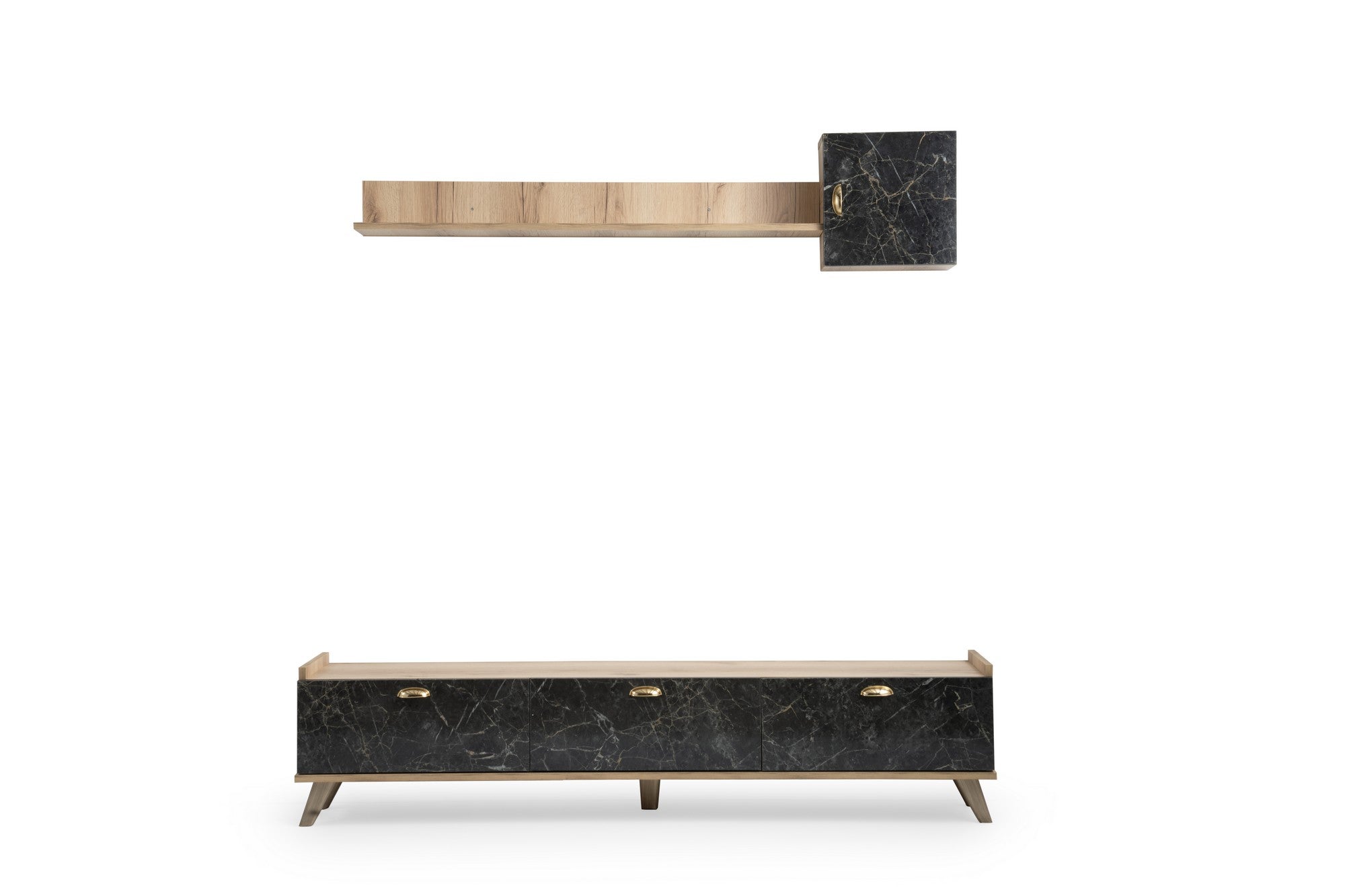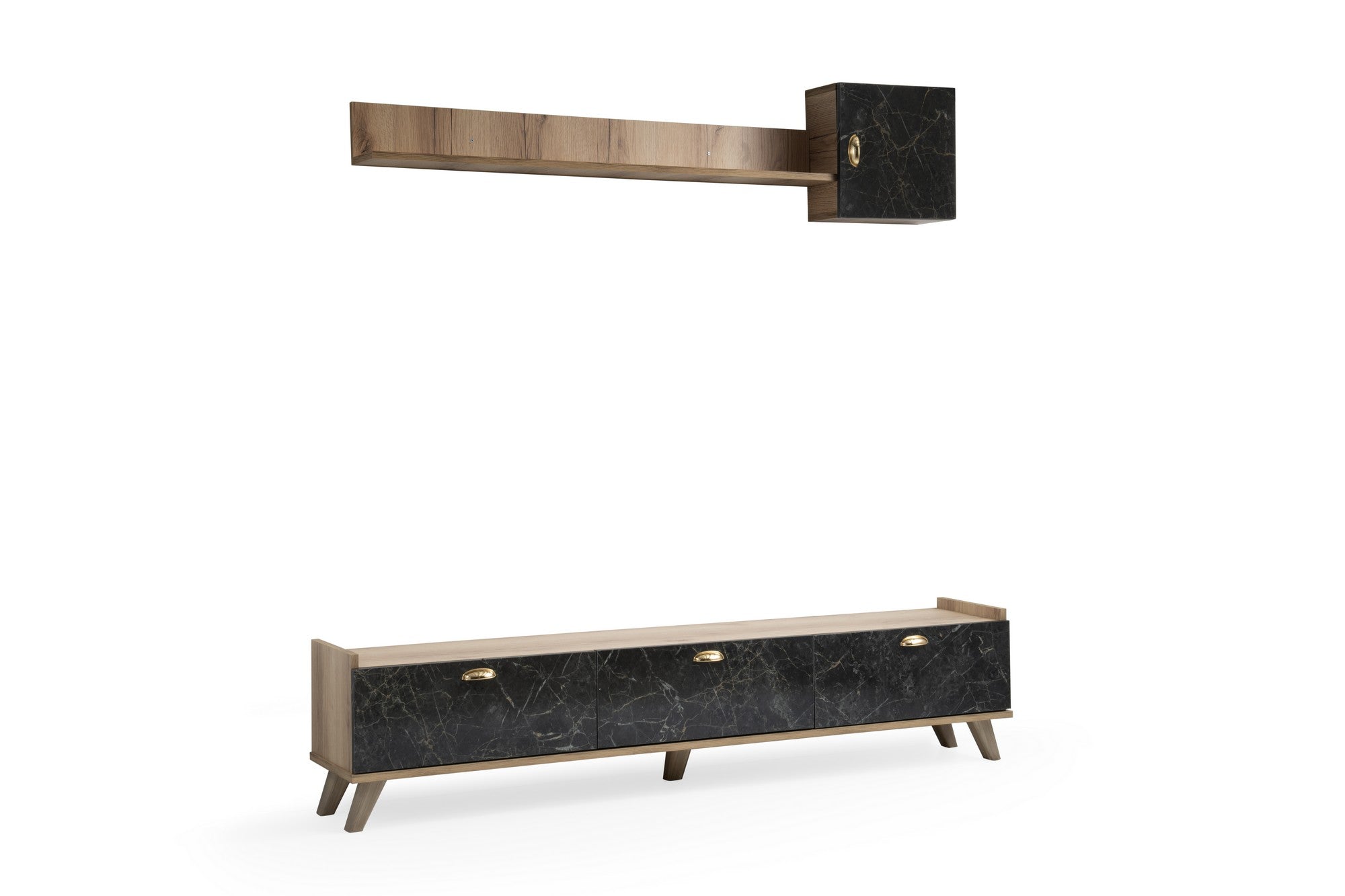 A 100% melaminbevonatú forgácslapból készült tv egység kivételes tartóssággal és hosszú élettartammal büszkélkedhet. A 18 mm-es vastagsága biztosítja a masszív és megbízható szerkezetet, amely kiállja az idő próbáját. A tölgy és márvány színek kombinációja eleganciát és kifinomultságot kölcsönöz bármely térnek.