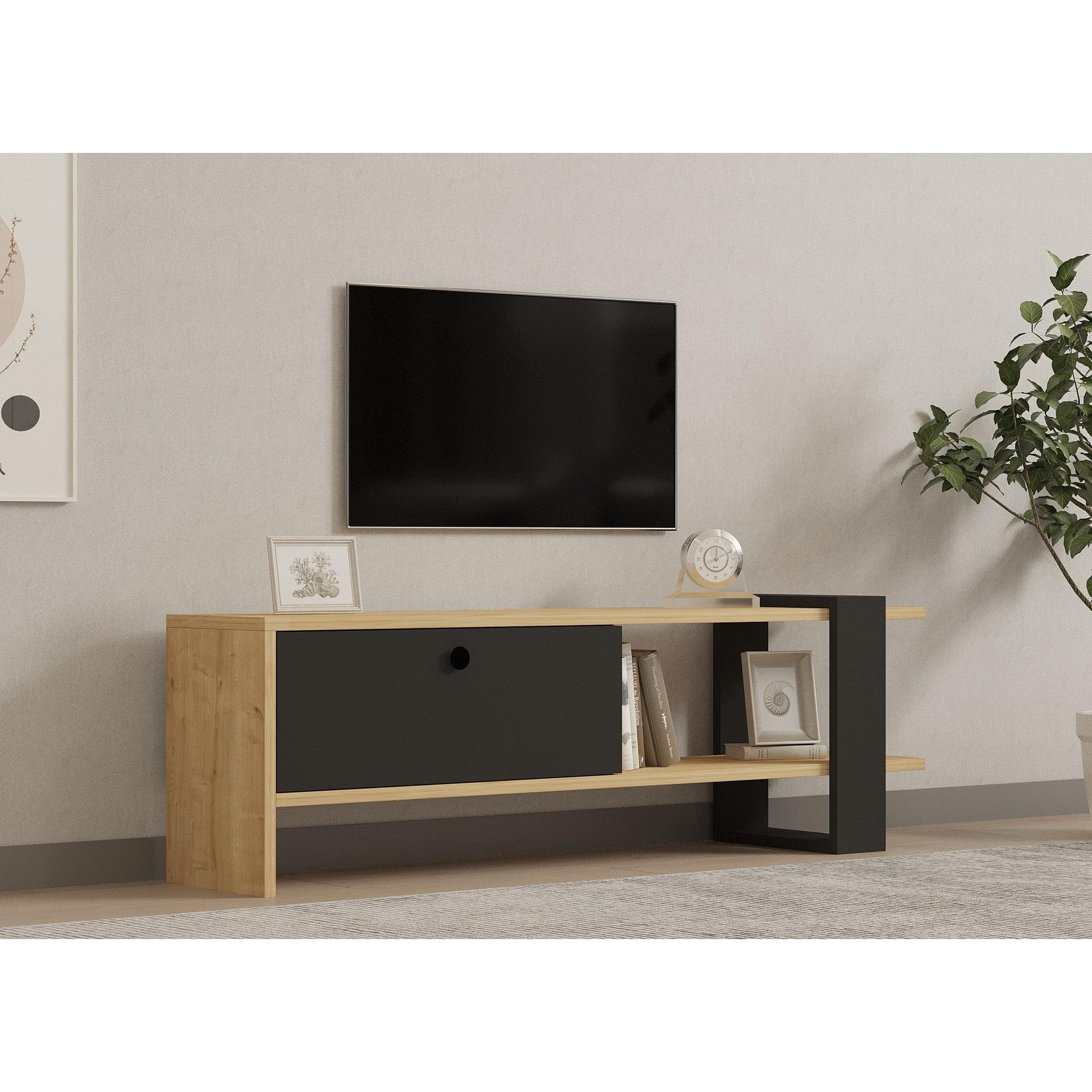 A tv-állvány az antracit és a tölgy szín gyönyörű kombinációjával rendelkezik, amely vizuálisan vonzó kontrasztot alkot, és azonnal megragadja a tekintetet. Ez a sokoldalú színösszeállítás lehetővé teszi, hogy az állvány zökkenőmentesen illeszkedjen bármilyen meglévő bútorhoz és dekorációhoz, így tökéletes kiegészítője lesz otthonának.