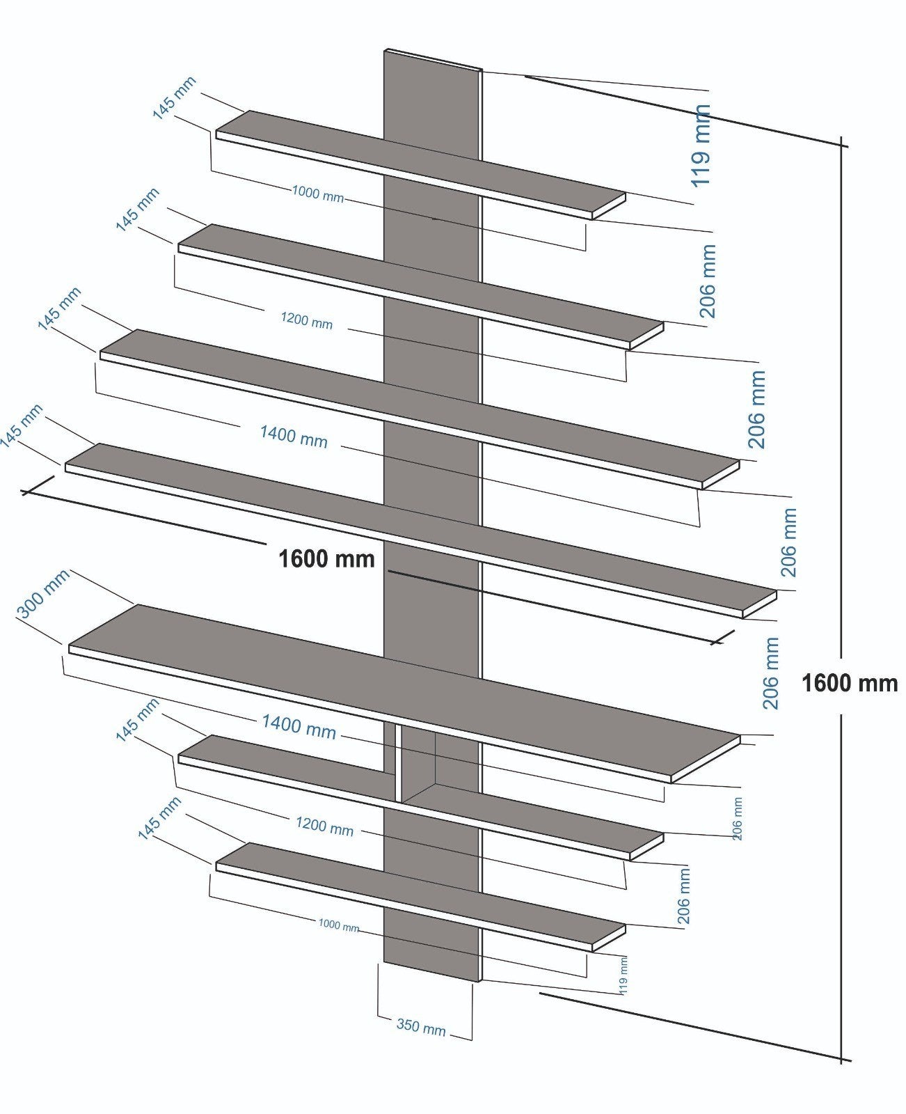 - Középső polc mérete: Szélesség: 160 cm, Mélység: 14,5 cm.